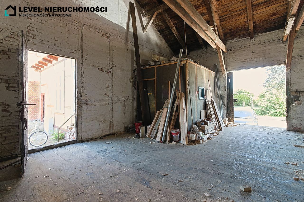 Budynek pomocniczy o powierzchni 120,2 m2 – dawny magazyn, idealny na warsztat, pracownię lub dodatkową przestrzeń użytkowa.
