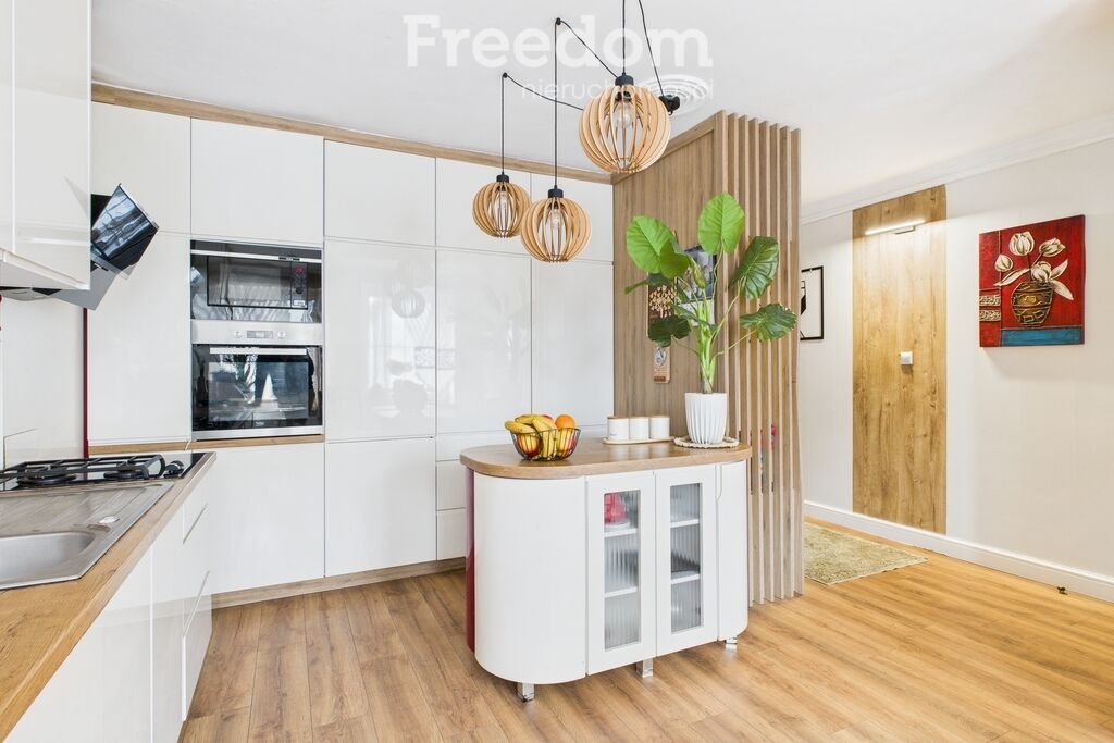 pełną zabudową meblową, obszernym blatem roboczym oraz wyspą